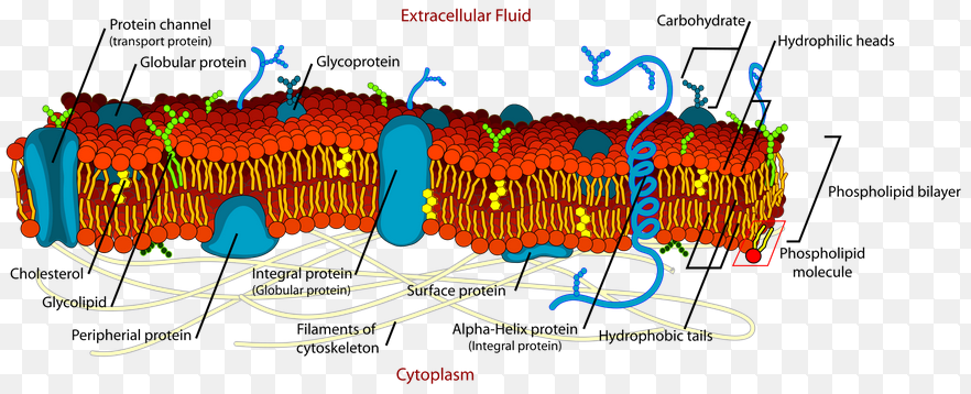 All cells have cell membranes. The membrane is composed of a lipid bilayer with transport proteins and carbohydrate chains imbedded in it. The phospholipid has a water-loving (hydrophilic) head and water-hating (hydrophobic) tails.